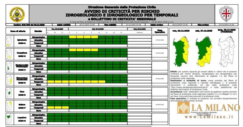 Allerta Meteo a Cagliari: Codice Giallo per Rischio Idrogeologico, Previsioni fino a Sabato Mezzogiorno. CAGLIARI – La Protezione Civile Regionale ha diramato un’allerta meteo di codice giallo (criticità ordinaria) per rischio idrogeologico che interesserà anche il territorio di Cagliari e l’intera zona del Campidano. L’avviso è valido a partire dalla mezzanotte di oggi, venerdì 26 dicembre 2025, […]